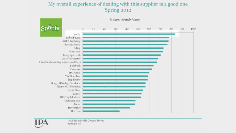 We are so proud of Spotify for rocking the IPA Media Owner Survey, According to the article, this is the first time in over three years that a new leader has emerged as Specific Media has been top since autumn 2008. It is also the first time a new entrant to the survey has leapt straight to the top.