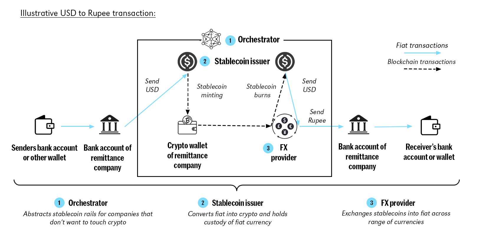The stablecoin stack is coming together at remarkable speed. At its foundation are the issuers, responsible for minting and redeeming tokens backed by fiat reserves. Built on top are FX providers and liquidity orchestrators, transforming the messy mechanics of conversion and settlement into a seamless interface. Above them sits the application layer – remittance firms, PSPs, payroll platforms, and neobanks – that weave stablecoins into everyday financial services.