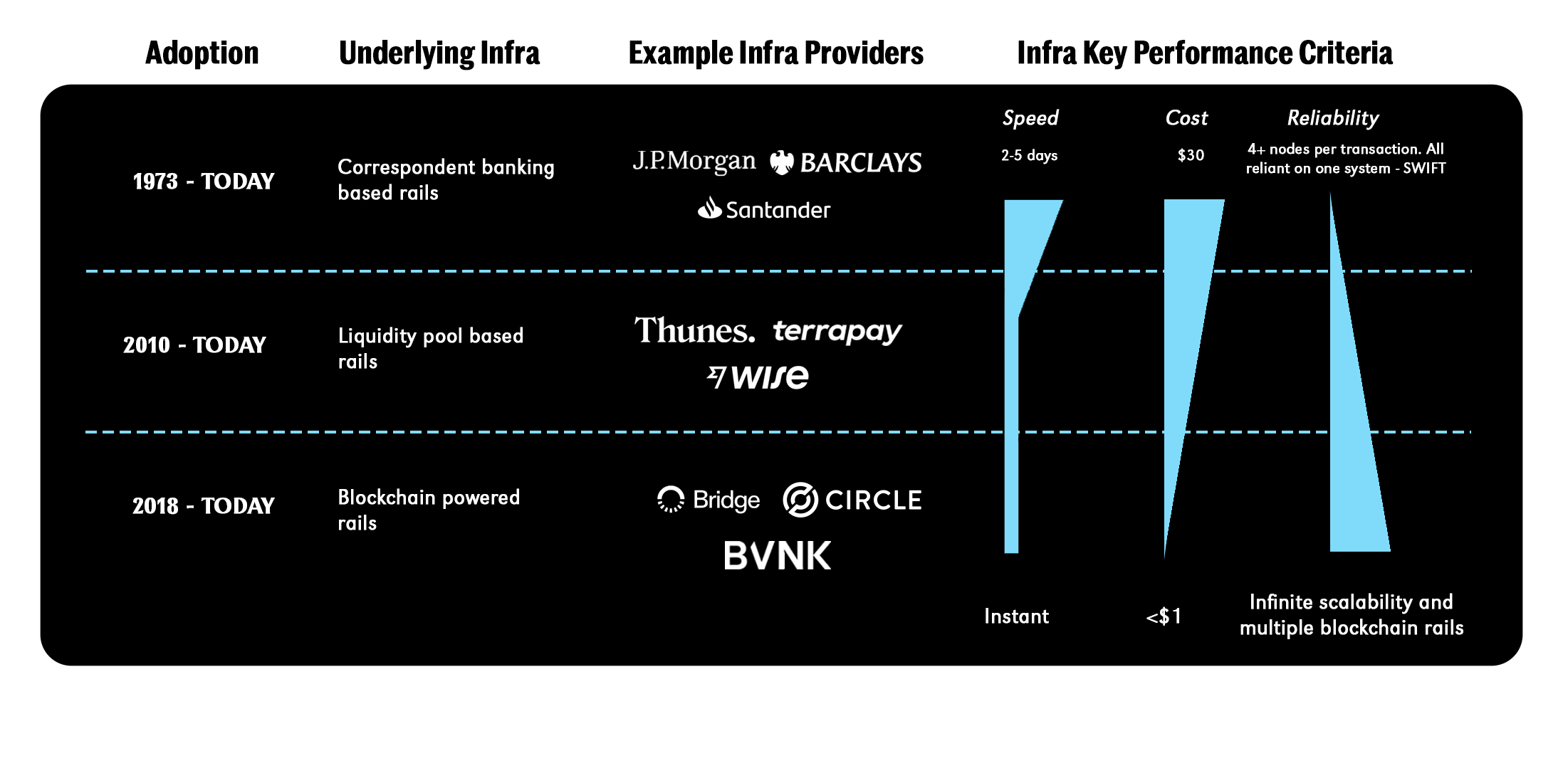 Settlement often takes days, and costs accumulate at every step in the chain. Attempts at modernization over the past decade (liquidity pools, API layers) have only wrapped new technology around old infrastructure without solving the problems at its core.