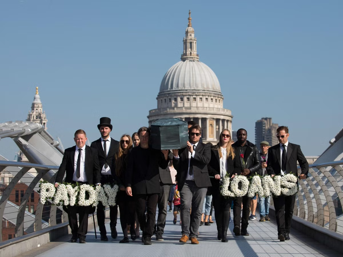But this was no somber occasion for those involved. Quite the opposite. The “funeral” was dedicated to the “death of payday loans”: the predatory lending practice that saw thousands of low-income workers spiral into uncontrollable debt, its death embodied by the collapse of notorious firms like Wonga. The photo made the headlines in the British press, plastered across the front pages of The Telegraph, The Guardian, and The Times.